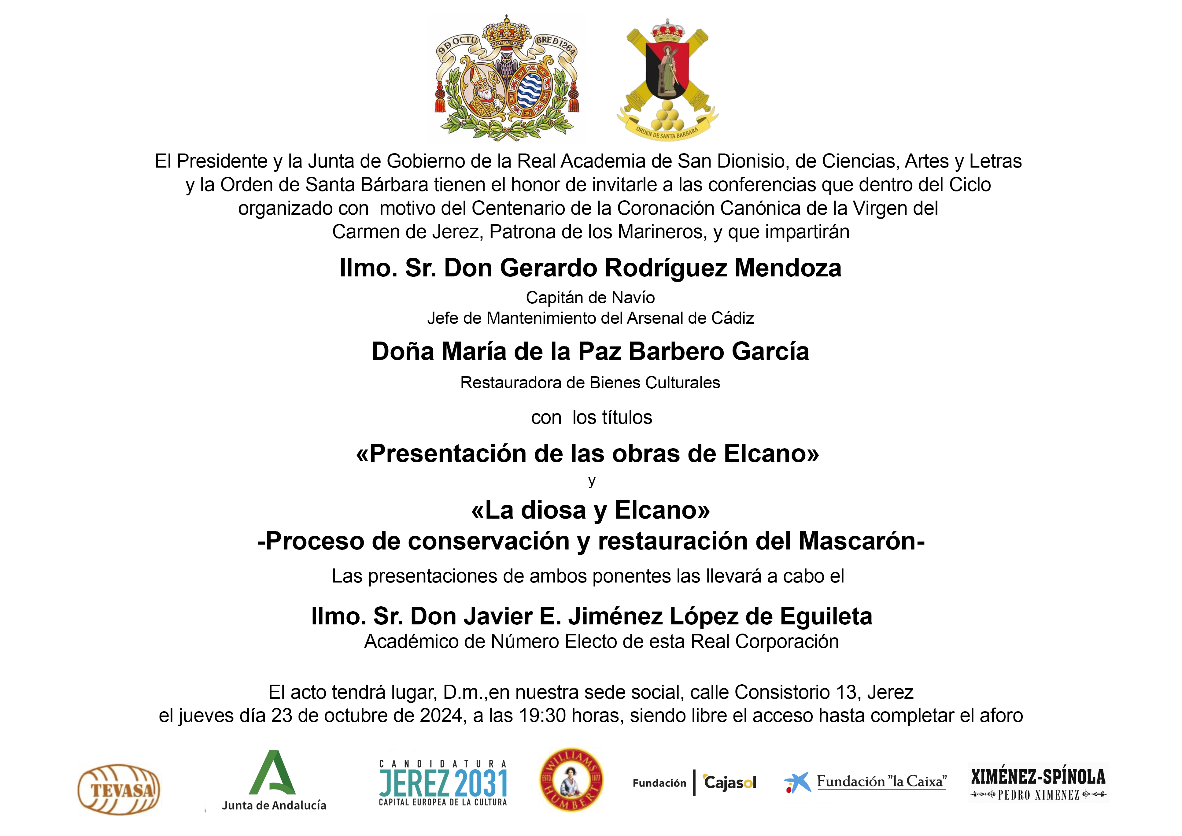El Presidente y la Junta de Gobierno de la Real Academia de San Dionisio, de Ciencias, Artes y Letras y la Orden de Santa Bárbara tienen el honor de invitarle a las conferencias que dentro del Ciclo organizado con motivo del Centenario de la Coronación Canónica de la Virgen del Carmen de Jerez, Patrona de los Marineros, y que impartirán el lImo. Sr. Don Gerardo Rodríguez Mendoza, Capitán de Navío y Jefe de Mantenimiento del Arsenal de Cádiz; así como Doña María de la Paz Barbero García, Restauradora de Bienes Culturales, con los títulos «Presentación de las obras de Elcano» y «La diosa y Elcano» -Proceso de conservación y restauración del Mascarón-.