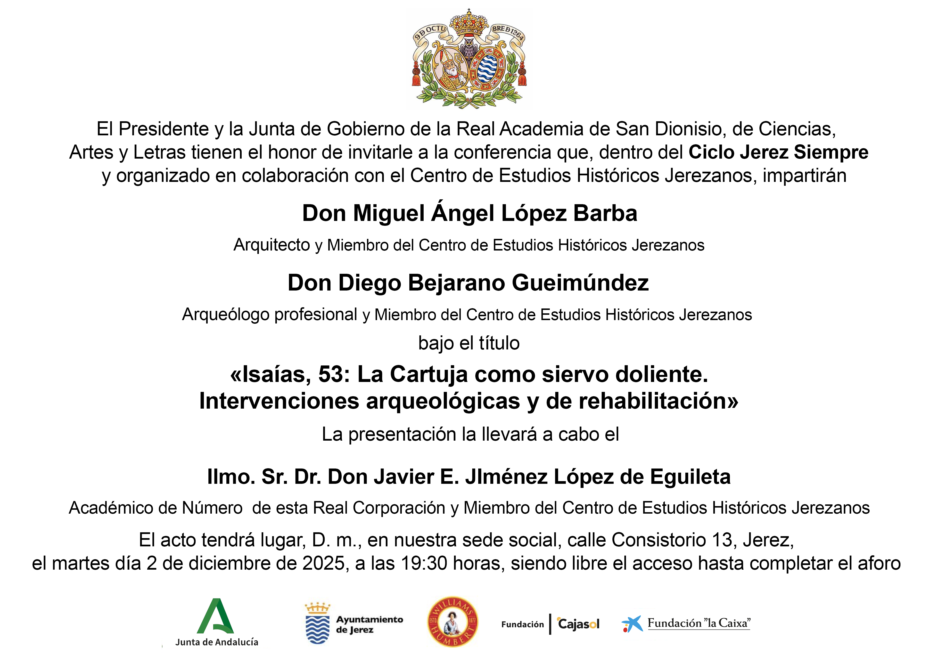 El Presidente y la Junta de Gobierno de la Real Academia de San Dionisio, de Ciencias, Artes y Letras tienen el honor de invitarle a la conferencia que, dentro del Ciclo Jerez Siempre y organizado en colaboración con el Centro de Estudios Históricos Jerezanos, impartirán Don Miguel Ángel López Barba, Arquitecto y Miembro del Centro de Estudios Históricos Jerezanos, y Don Diego Bejarano Gueimúndez, Arqueólogo profesional y Miembro del Centro de Estudios Históricos Jerezanos bajo el título «Isaías, 53: La Cartuja como siervo doliente. Intervenciones arqueológicas y de rehabilitación».